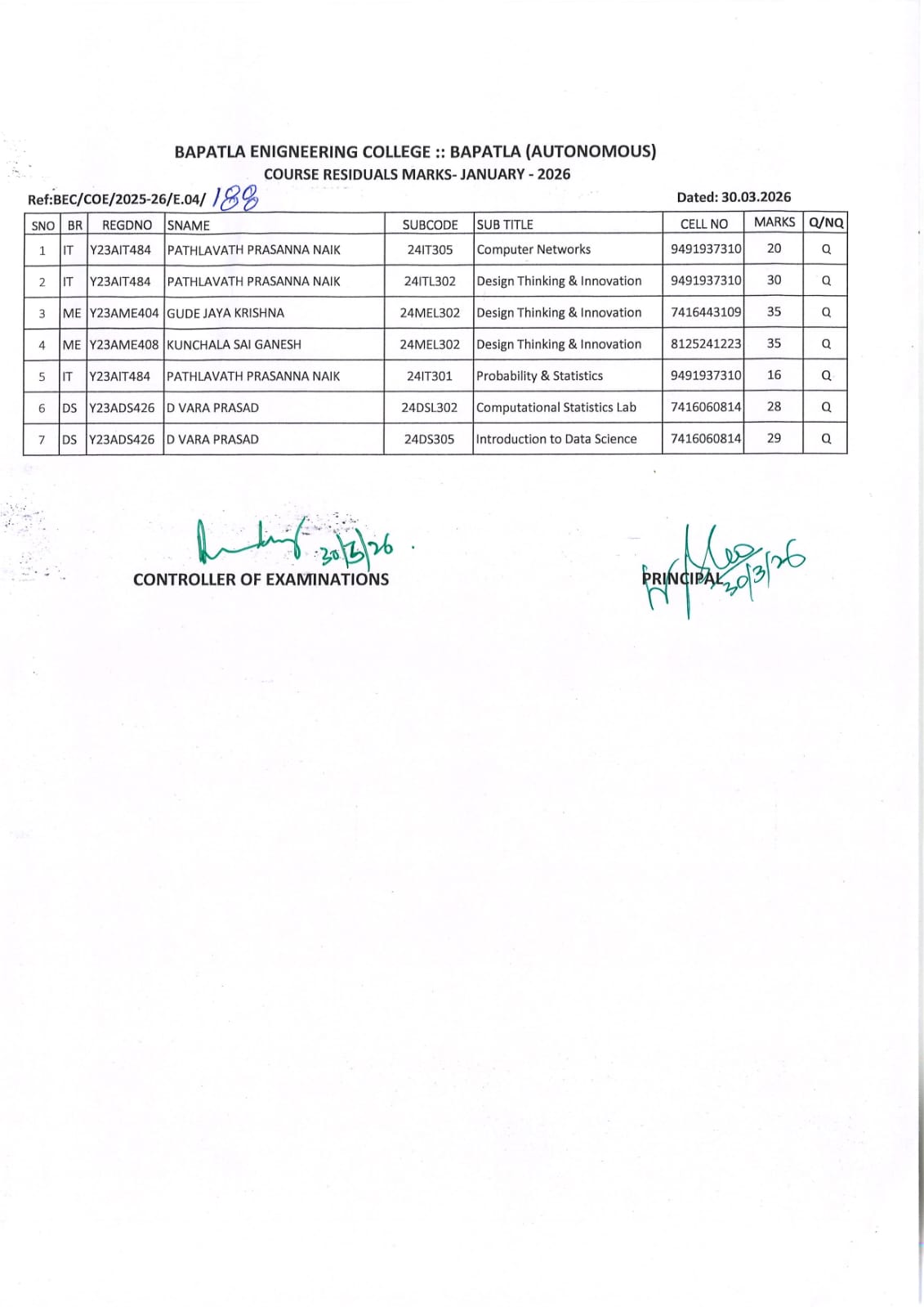 Course Residuals Marks – January 2026